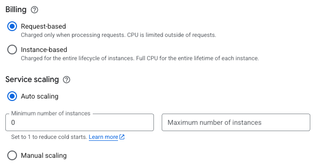 There’s also two CPU allocation modes. “CPU only during request processing” means you pay for CPU only when handling requests. “CPU always allocated” lets your container run background tasks between requests.